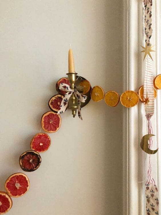 Okay, first and foremost, I want to highlight these homemade dried orange garlands. They are super simple to make, and they are showstoppers for a plentiful, natural Friendsgiving celebration. You can either hang them around your house or bundle them together for a table centerpiece. Simply cut the oranges into slices, bake at 350F for 45 minutes then thread through with a needle and string. Easy.