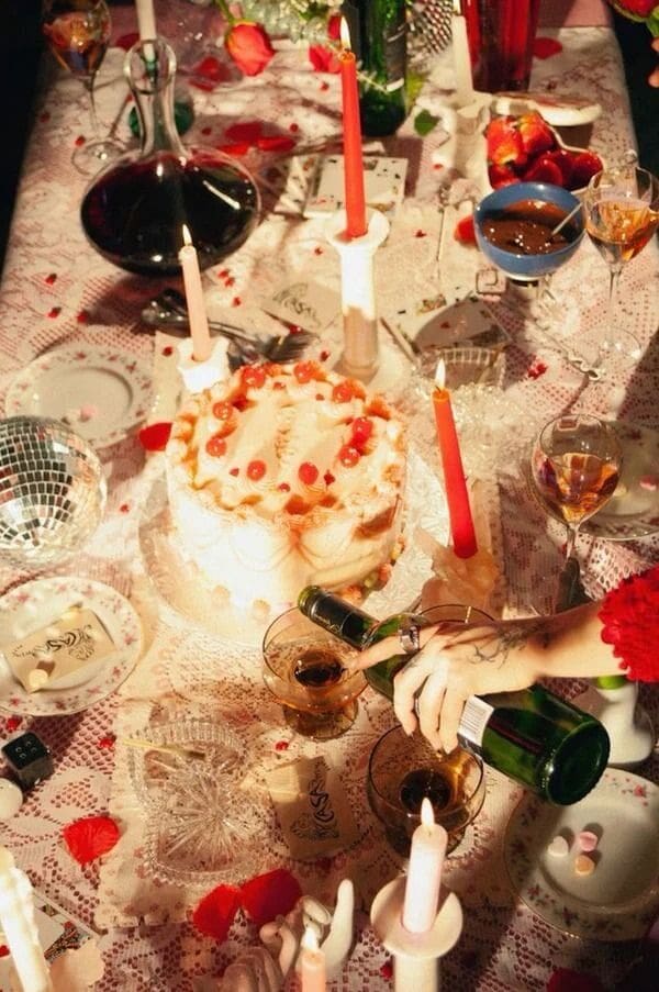 Now, for the dinner party, think extravaganza on the table setting. Messy but sophisticated, dripping in hearts, flower petals, and candles. Yes. Please.