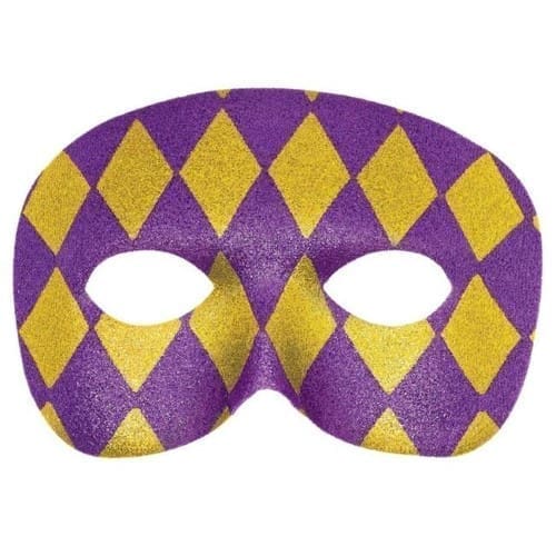 - Our harlequin mask is loaded with purple and gold glitter.