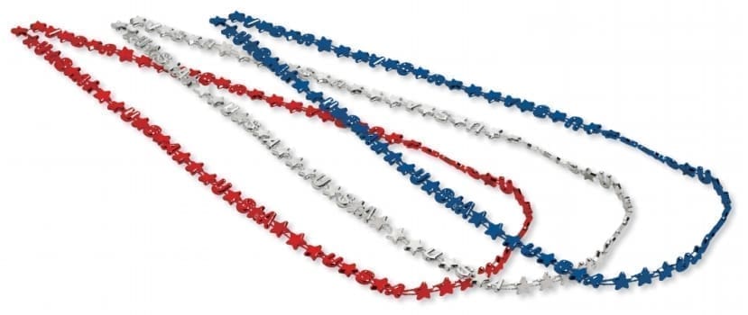 Show off your American spirit with these USA Necklaces. Made in the symbolic colors of red, white, and blue, each necklace features stars and “USA” beads! Sold in packages of 3, these coordinate great with our other USA party supplies. The USA Necklaces are the perfect addition to your 4th of July celebration! Gender: unisex.