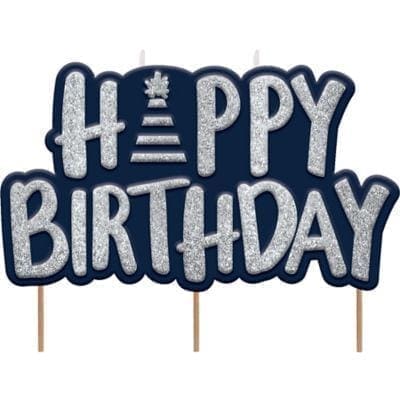 This birthday candle is perfect no matter what age the celebrant is turning. The navy candle features the headline Happy Birthday in silver glitter. The A is adorably replaced by a party hat. Top off a birthday cake with it and let the celebrant make a wish. A Reason to Celebrate Happy Birthday Candle product details: 4in wide x 1-2in long x 2 1-2in tall Design on one side only.