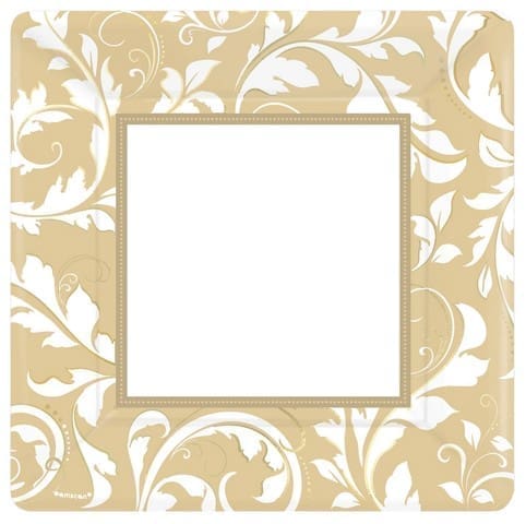 These metallic dinnerplates have a gold and white floral border, with a white center, making them perfect for your formal event. Each pack of 8 measure 10”x 10”.64 Total Pieces.Multicolor Printed Metallic Paper.10″ (l) x 10″ (w).8/pack.Celebrate your 50th anniversary with these 10” x 10” metallic plates Color: gold/metallic.