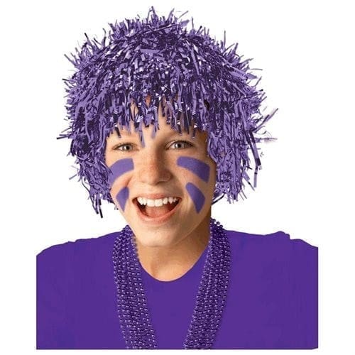 An elasticized cap keeps this wig on tight, no matter what the weather or score. One size fits most teens and adults. Features Type – Foil Wig. Design – Team Spirit Fun. Color – Purple. Dimension – 10 x 3.6 x 1.25 in. Item Weight – 0.1 lbs.