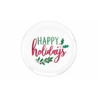 Set a lovely table this season with help Christmas Happy Holidays 7-1/2″ Coupe Plates. Durable plastic plates can be piled high with treats or a whole meal. Made from plastic. Not microwave safe. Reusable. Hand wash only.