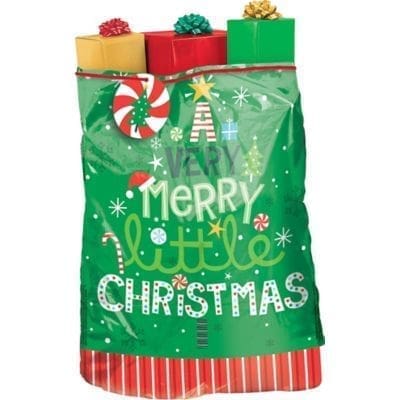 Bring all of your gifts to the holiday party in a stylish gift sack. The giant size can accommodate several gifts for everyone on your list. Giant size can accommodate 1 large gift or several smaller gifts. Durable plastic construction is reusable. Draw string tie for secure closure and carrying. Included gift tag for labeling. Festive design features the message “A Very Merry Little Christmas” and decorations.