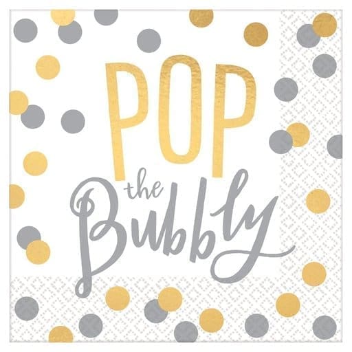 Get ready for the ball to drop and pop some champagne for the new year with these beverage napkins. Each festive napkin is made of 2-ply paper, making it ideal for holding treats, serving guests or cleaning up spills. 2-ply paper is soft and absorbent. Polka dots adorn the napkins along with a “Pop the Bubbly” message. Disposable design enables simple cleanup.
