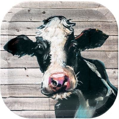 Everyone at your farm-themed party can enjoy delicious party foods on Barnwood Cow Lunch Plates! These square paper plates feature a cow against a barnwood-print pattern. Mix and match these plates with other Barnwood tableware to complete the place settings for any event or celebration including a summer party farm fresh community event family picnic or barbeque. Barnwood Cow Lunch Plates product details: 8 per package 9in x 9in.