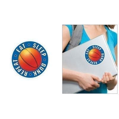 With a Basketball Decal you can turn your room into a private stadium! This basketball window decoration features an orange basketball surrounded by a headline that reads Eat Sleep Dunk Repeat on a blue border. Simply peel and stick this sporty decoration to any smooth surface such as a mirror or window then remove it without residue! Basketball Decal product details: 4in diameter Vinyl Damage-free adhesive Reusable.