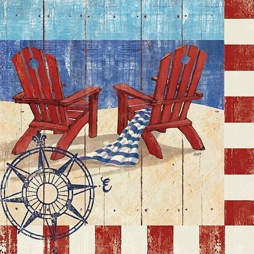 These Beach Bums Beverage Napkins feature a distressed checkered border with the center showing two red Adirondack chairs, a striped beach towel and compass on a sandy beach looking out on the water. Made of paper Measures 5″ square Package of 16 Great for pairing with drinks and desserts