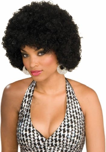 Top off a Halloween costume with this fun Black Afro Wig. It is made of synthetic fiber and features multitudes of large ringlets and curls. Simply add a wig cap to this adult Halloween costume accessory and you will be ready for trick or treating or the party. It is one size fits most and is ideal for wearing with a disco dude, dashing diva or fashionable clown costume. This curly black wig is suitable for Halloween, costume parties, character reenactments, parties, parades, family occasions and other holiday productions and festivities.