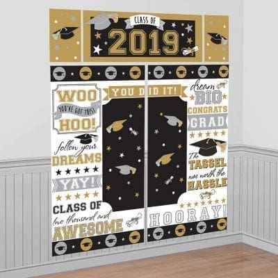 Set the scene for a gorgeous graduation party with a Black Gold & Silver 2020 Graduation Scene Setter! This plastic wall decoration features shiny silver white and gold graduation caps diplomas and stars. The phrase Congrats Grad is printed in large black gold and silver block letters across the banner while the two large posters read Congrats Grad! and Class of 2020. Two smaller posters feature silver and gold graduation caps and read Way to go! and Great Job! Suitable for indoor and outdoor use the Black Gold & Silver 2020 Graduation Scene Setter makes a great photo background and can be adhered to any flat surface using tape or Sticky Tack (sold separately). Measures 65in x 75in when assembled. Black Gold & Silver 2020 Graduation Scene Setter includes: Banner 44in wide x 16in tall 2 large posters 32 1-2in wide x 59in tall 2 small posters 10in wide x 16in tall.