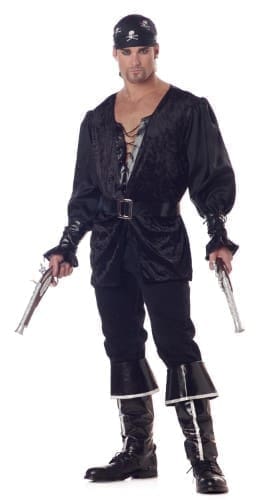 Svelvet shirt with attached satin sleeves; Printed bandana; Boot covers; Belt; Wrist cuffs; Pants and guns not included.