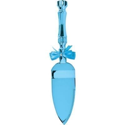 It’s cake time! Serve up delicious cake at your baby shower with a Blue Cake Server! This metallic blue plastic cake server features a cute blue bow on the handle. The serrated edge makes it easy to cut the baby shower cake. Blue Cake Server product details: 2in wide x 10 1-4in long Plastic.