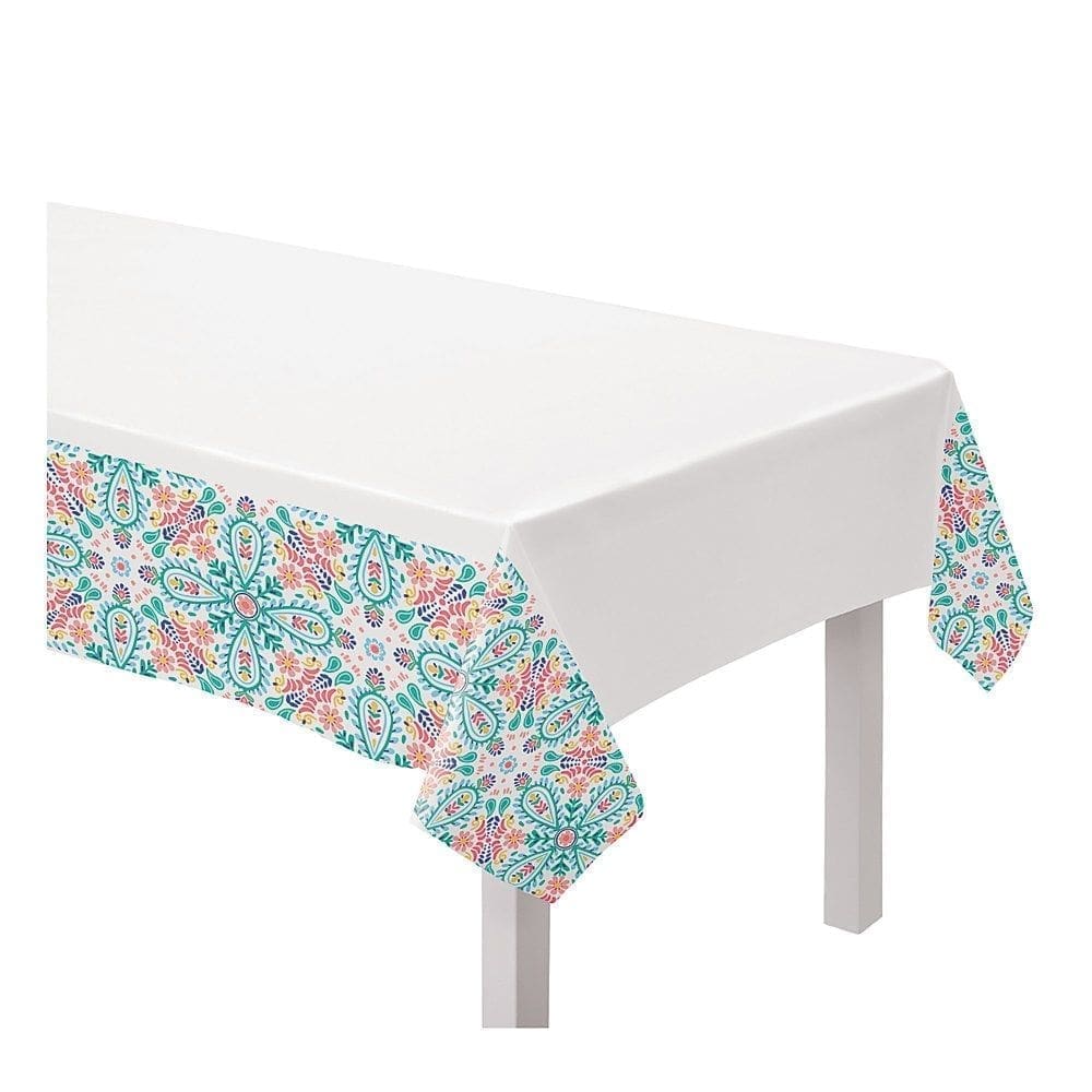 Give your tableware a beautiful base with this fabric table cover. It features an ornate and colorful floral pattern on the skirt and the center is solid white to show off your table settings. This tablecloth is perfect for indoor or outdoor gatherings especially summertime dinner parties. Boho Vibes Floral Geometry Fabric Tablecloth product details: 60in wide x 104in long Suitable for indoor or outdoor use Reusable.