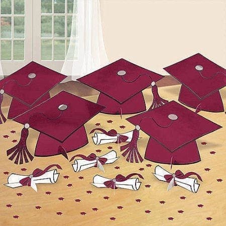 This Burgundy Graduation Table Decorating Kit includes everything you need to make your graduation party tables coordinate with your school colors! Each kit contains: 5 – 15″ diameter graduation caps 5 – 7″ long diplomas 1 – 1/2 ounce bag of metallic foil graduation cap confetti.
