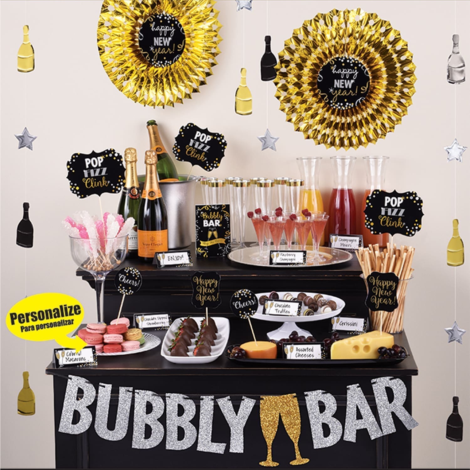 This Champagne Bar Decorating Kit features all the decor you’ll need to set up a great bubbly bar display for a New Year’s celebration. Made of paper, foil and wood 1 – 9′ glitter BUBBLY BAR letter banner 1 – 6″ Bubbly Bar tent card 8 – 2″ small tent cards 2 – 14 1/2″ Happy New Year gold foil fans 4 – 72″ foil champagne bottle and star string decorations 3 – 12 1/2″ large Pop Fizz Clink picks 2 – 7 3/4″ Happy New Year! picks 2 – 7 3/4″ Cheers! picks.