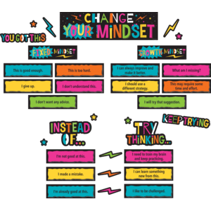 Teach students, strategies that allow learning and intelligence to grow with time, effort, and experience. Includes “Change Your Mindset” title piece and 2 mindset header pieces, “Instead Of…” and “Try Thinking…” pieces, 8 fixed mindset cards, 8 growth mindset cards, 2 positive sayings, 12 lightning bolts, and 12 stars. Title piece measures 21″ x 6″. 47 total pieces.