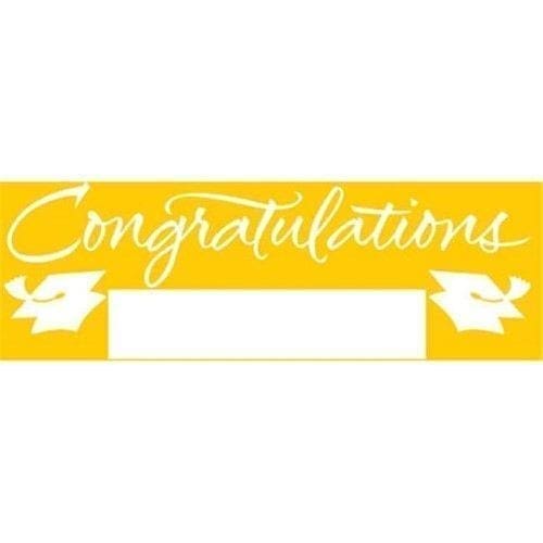Make your grad feel special by saying congratulations in a big way. The Yellow Graduation Party Banner measures 20″ x 60″ and displays mortarboards and large text reading “Congratulations” along with a large white section to be filled in with the grads name or a customized message. This banner is sold individually and coordinates with other graduation party decor. Gender: unisex.