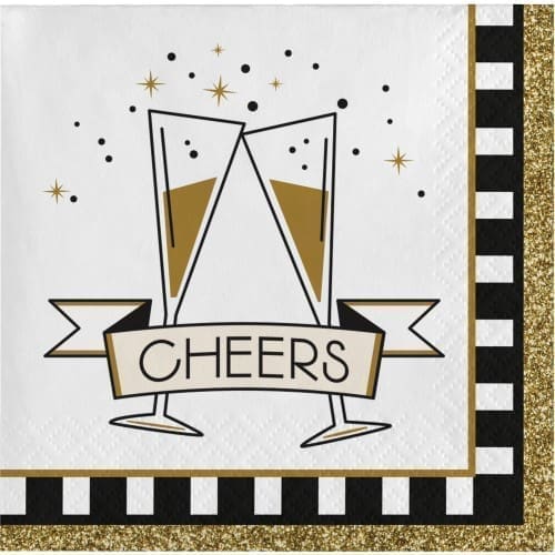 .16-Count package of 2-ply paper beverage napkins.Approximately 5 x 5-inch folded; made in the USA.Reads: Cheers; champagne flutes clink together in celebration, features border with black and white and glittery gold.Ideal for bringing in the New Year or any celebration worthy of champagne.Look for Midnight Celebration tableware and coordinating Touch of Color solids Glittering Gold and Black Velvet.