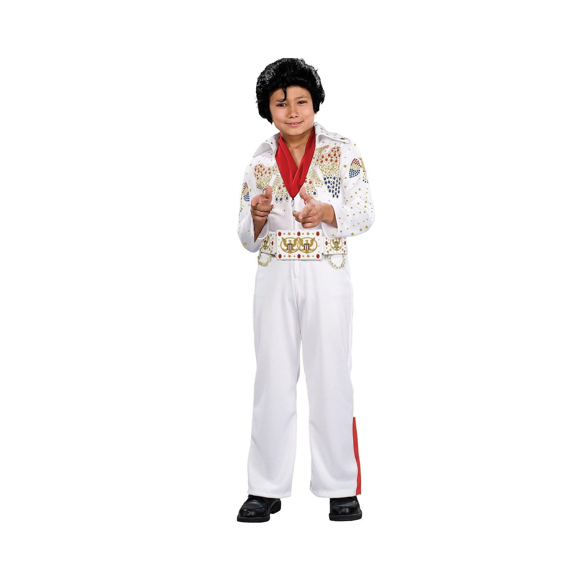 The Deluxe Elvis Toddler Halloween Costume will turn any child into the King of Rock and Roll. It features a white one-piece jumpsuit with a colorful pattern and sparkling glitter. The Elvis toddler costume also includes a belt with gold chains and a red scarf. This officially licensed costume is based on the outfit The King wore on stage, so it looks like the real deal. It is specially designed to fit toddlers. The one-piece Halloween costume jumpsuit with accessories is also ideal for parties, parades, family occasions and other holidays and festivities. It is made from a comfortable polyester material and the fabric is hand washable. With this costume, kids will have a lot of fun at Halloween.