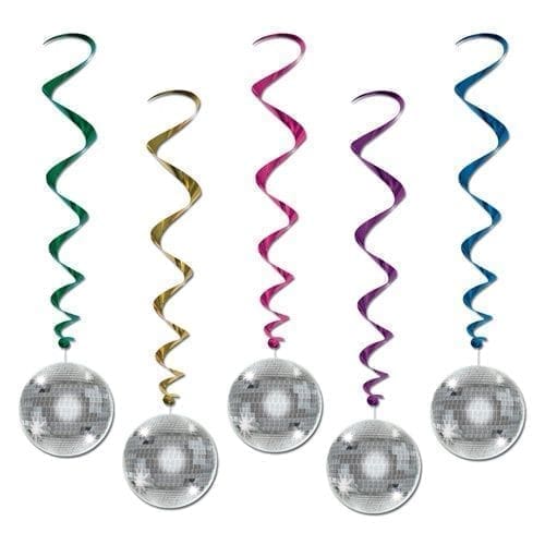 Hang these assorted colored Disco Ball Whirls from your ceiling to instantly transform your venue. The mylar swirls hang down 38″ and include a 5.75″ paper mirror ball. Sold in a package of five. Turn your event into a disco party scene with Disco Ball Whirls.