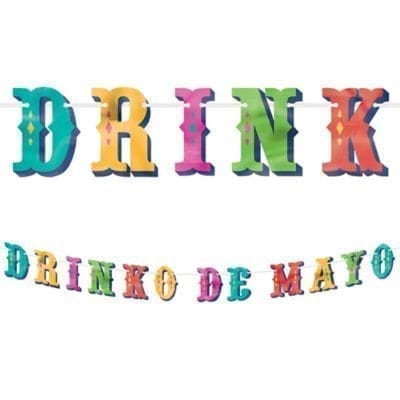 Welcome guests to your fiesta party with a multicolor letter banner! This bright decoration features individual letters inspired by papel picado paper art that read: Drinko de Mayo. This silly party banner is strung along ribbon for easy display on your buffet table banner or entryway. Let guests know they’re in for a great party with this whimsical decoration. Drinko de Mayo Letter Banner product details: 6 1-2ft wide x 12in tall Attached ribbon for hanging.