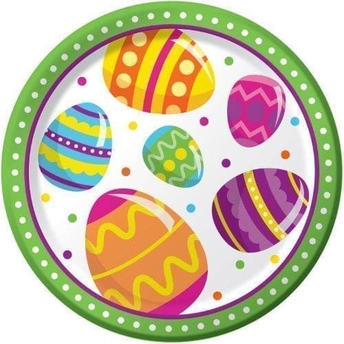Egg Fun Dessert Plates, 8pk:8 Egg Fun Dessert PlatesEgg Fun Cake Plates measure 7″ roundSturdy Style paper platesIdeal for spring get-togethers celebrations.