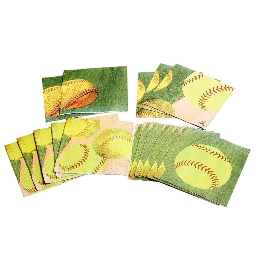 Score big when you serve up Fastpitch Softball Beverage Napkins! These small paper napkins feature a realistic printed image bright yellow softballs on a background of a softball field. Use these sports napkins for spills and messes when you invite the team over after a game. These paper napkins are also a perfect addition to your child’s sports-theme birthday party. Fastpitch Softball Beverage Napkins product details: 16 per package 5in x 5in when folded 2-ply paper.