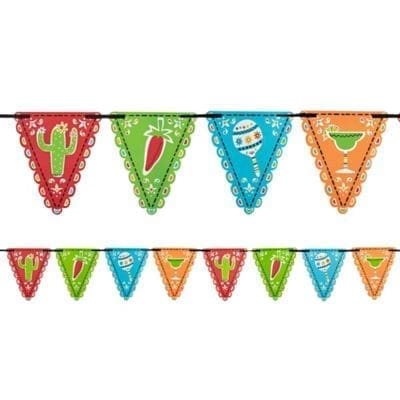 Your Cinco de Mayo fiesta will be looking vibrant when you decorate with a Fiesta Pennant Banner! This banner features blue green orange and red cardstock pennant flags with designs of maracas margaritas and more. Hang this pennant banner on the wall stair railing or anywhere in the house to add some decorative color to your Cinco de Mayo celebration! Fiesta Pennant Banner product details: 15ft wide when assembled 24 flags 6in wide x 7in tall Cardstock Includes ribbon for hanging.