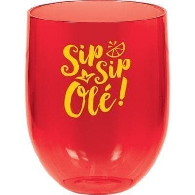 Sip some wine at your next celebration from this Fiesta Plastic Stemless Wine Glass! The plastic cup comes in a translucent red color with the headline Sip Sip Olé next to a lime wedge silhouette. Serve your friends and family some delicious drinks at your Cinco de Mayo or DÍa de los Muertos celebration in this cup! Fiesta Plastic Stemless Wine Glass product details: 15.2oz capacity 3 1-4in diameter x 4 1-4in tall.