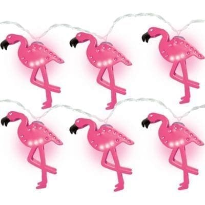 Make your summer party colorful and bright by decorating with Flamingo LED String Lights! The string lights feature attached covers that look like flamingos. String these flamingo lights along the wall on a stair railing or anywhere else in your home. Turn your party into a tropical island by decorating with these flamingo lights! Flamingo LED String Lights product details: 4 1-2ft total length 3ft lighted length 10 lights 2in wide x 2 1-2in tall Attached battery pack On-off switch Require 2 AA batteries (not included).