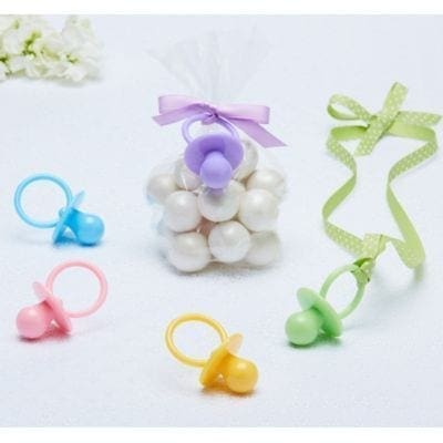 Charm baby shower guests with adorable Gender-Neutral Pacifier Baby Shower Favor Charms! These blue green pink purple and yellow plastic charms are in the shape of baby pacifiers making them perfect for baby showers or christenings. Tie plastic pacifiers to favor bags or boxes use them as napkin rings or sprinkle them on your party tables for an extra-sweet party decoration. Gender-Neutral Pacifier Baby Shower Favor Charms product details: 8 per package 5 assorted colors: blue green pink purple and yellow 1 1-4in wide x 1 1-4in long x 2 1-4in tall Plastic.