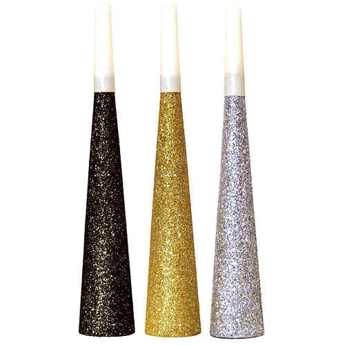 These Glitter Cone Horns come in assorted colors of black, silver and gold featuring a plastic mouthpiece. Each 9″ long Cone Shaped Party Horn has an opening that measures 1 1/2″ in diameter. Our Glitter Cone Horns are sold individually and we cannot guarantee a color selection.