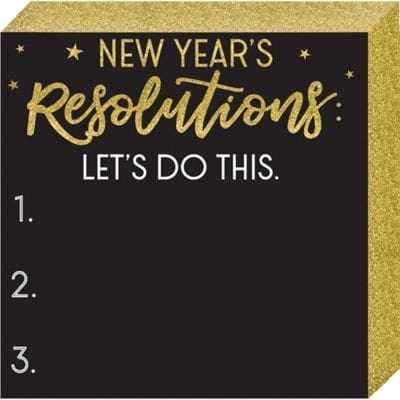 Keep a reminder of your resolutions with a Glitter Gold New Year’s Resolutions Chalkboard Sign! The fiberboard sign has a chalkboard surface and features a glitter gold and white New Year’s Resolutions: Let’s Do This headline with three number bullets to write your resolutions next to. Guests at your home will know what you’re trying to accomplish in the new year when you decorate with this sign! Glitter Gold New Year’s Resolutions Chalkboard Sign product details: 7 1-2in wide x 1 1-4in long x 7 1-2in tall.