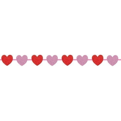 Surprise your loved one this Valentine’s Day by using this Glitter Hearts Ribbon Garland. Featuring pink and red hearts, each strand is featured with a glitter surface creating the perfect addition to your Valentine’s Day celebration. This ribbon garland measures 12 ft. long.
