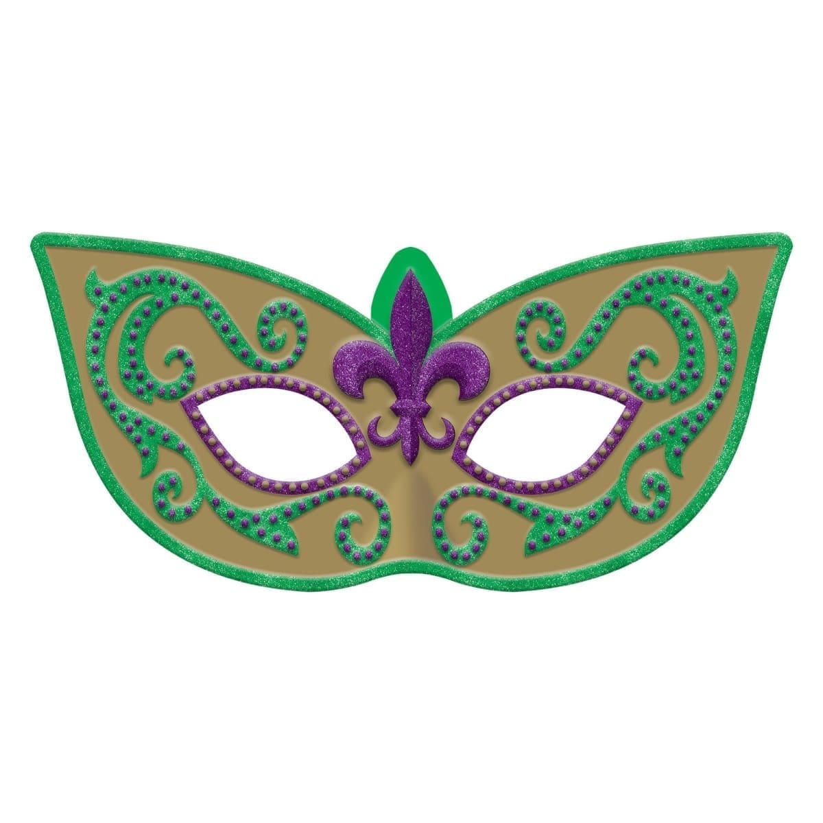 Set the scene for your Mardi Gras party by decorating with a Glitter Mardi Gras Masquerade Mask Sign! The plastic sign is a gold masquerade mask with green and purple glitter designs. Hang this mask on the wall to complete the rest of your Mardi Gras decorations. Get ready for your Mardi Gras festivities by decorating with a masquerade mask! Glitter Mardi Gras Masquerade Mask Sign product details: 26in wide x 13in tall.