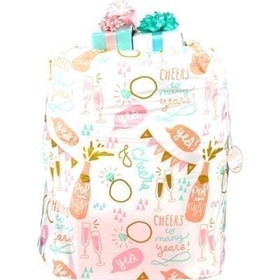 Transport your wedding gifts in style with this Gold & Pink Wedding Gift Sack! This white plastic sack features headlines like Pop The Bubbly and Cheers To Many Years surrounded by printed champagne glasses diamond rings and banners. The sack comes with a matching gift tag in the shape of a diamond ring and reads Cheers To Many Years in the center. Fill this drawstring sack with your wedding or wedding shower gifts or use it to wrap one large present for someone special! Gold & Pink Wedding Gift Sack product details: 36in wide x 44in tall.