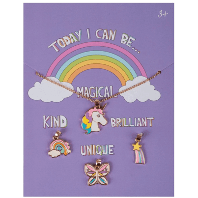 Today you have the power to be kind, unique, brilliant and magical. You can do anything you set your mind too! Performing in the school play? Be brilliant! Playing with your little bother? Be kind! This necklace set includes one golden chain, 4 interchangeable charms and comes in a pretty pink box. Safety Warnings: Keep away from fire and Small Parts.