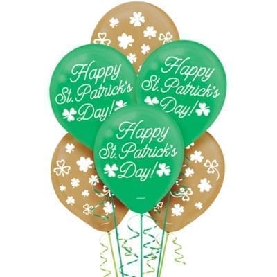 Decorate for a shamrockin St. Patricks Day with Green & Gold St. Patricks Day Balloons! These green and gold latex balloons feature a printed white shamrock design or a Happy St. Patricks Day headline. Use them alone at a St. Patricks Day party in your home or classroom or create a balloon bouquet with other St. Patricks Day balloons (sold separately)! Green & Gold St. Patricks Day Balloons product details: 15 per package 2 colors: green and gold 12in tall when fully inflated.