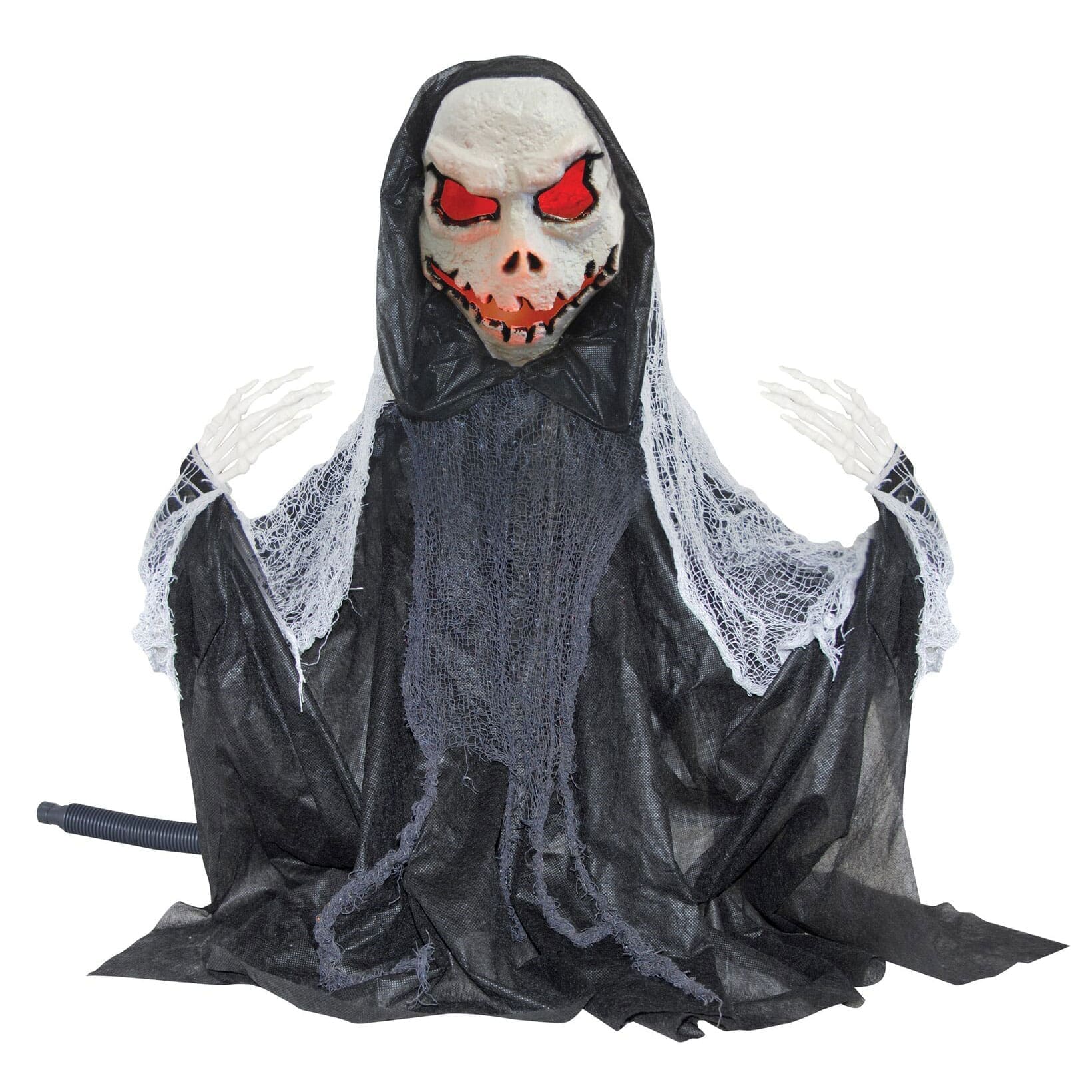 Our ?Groundbreaker Fogging Ghoul will add the perfect amount of creepiness to your Halloween decor. This haunting decoration features multi-colored LED lights that illuminate the inside of this zombie’s skull. For an extra frightening effect, attach the Groundbreaker Fogging Ghoul to your own fog machine and make eerie fog spill out of his face. Made of polyester, plastic and wire Measures 29″ high x 48″ wide x 7″ deep Requires 3 AG13 batteries, not included Includes tube to attach to your fog machine