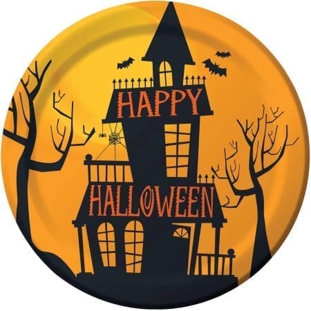 Serve delicious desserts and Halloween snacks at your spooky celebration with the Haunted Halloween Dessert Plates! These seven-inch cake plates feature an eerie scenery of a haunted mansion with a “Happy Halloween” caption. Sold in packages of eight, coordinate this Sturdy Style paper plate with other Haunted Halloween tableware for a unique and festive touch at your Halloween get-together.