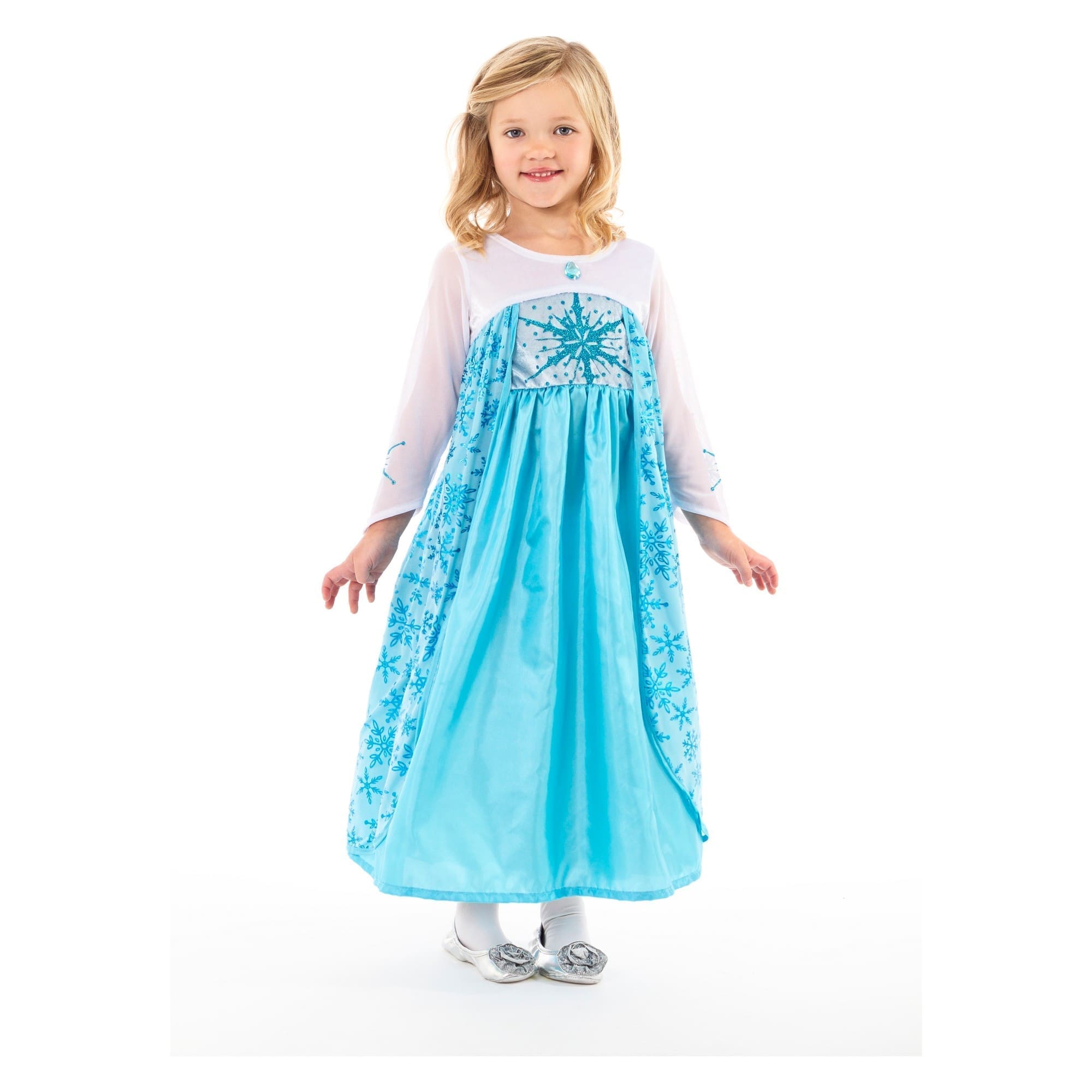 Let your little one fulfill her dream of reigning over her kingdom as the Ice Princess. The dress is made with a durable stretch velvet bodice and satin skirt, overlaid with a metallic snowflake design.