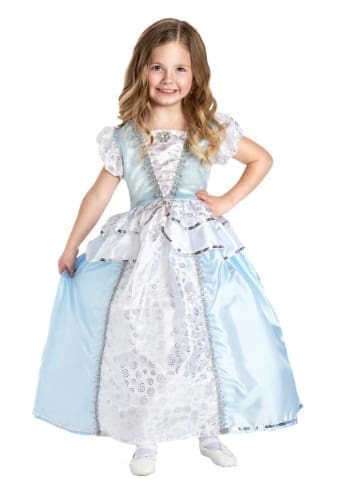 This newly redesigned glamorous dress is perfect for a night at the ball. The stretchy blue velvet bodice is elegantly detailed with a gathered white inlay, sparkling silver trim and a beaded flower. The silver trimmed hip drapes capture that authentic Cinderella look. Features: clothing quality fabrics; machine washable. Stretchy, soft and very comfortable. Color: Blue White. Gender: female.