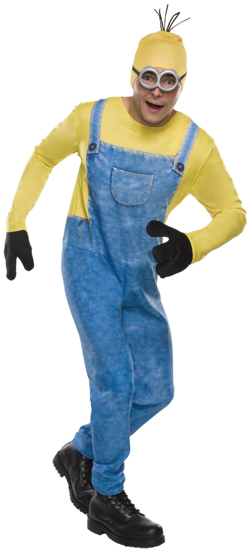 You can now dress up like your favorite Minion from the Despicable Me movies! Minon Kevin costume comes with a printed jumpsuit gloves headpiece and goggles. Adult standard size fits sizes up to 44. 100% Polyester. Care instructions: Do not dry clean bleach or iron. Hand wash in cold water and dry flat.