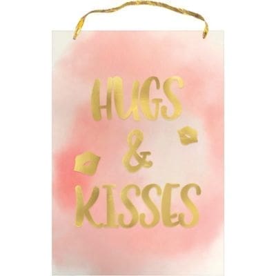 Decorate your home for Valentine’s Day with a bit of shine! This Metallic Hugs & Kisses Sign features the headline Hugs & Kisses in gold foil on a faded pink background. The headline has two lip silhouettes on either side to finish the design. Metallic Hugs & Kisses Sign product details: 8 1-4in wide x 12in tall Attached loop 2 1-2in drop length.