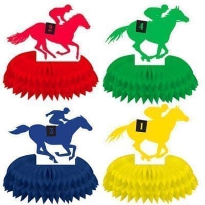 Number your Derby Day tables with these Mini Derby Day Honeycomb Centerpieces! The blue green red and yellow centerpieces feature a jockey riding a numbered derby horse. Place one in the center of each table or create a racetrack scene by arranging them on a buffet table! Mini Derby Day Honeycomb Centerpieces product details: 4 per package 6in diameter Arrive flat Simple assembly required.