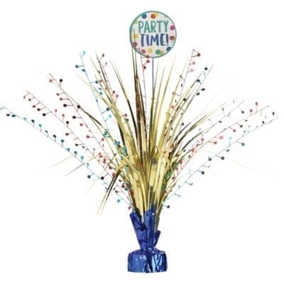 This shining table decoration has tall metallic blue gold and red wires that you can fan out for a pretty display. Atop the centerpiece a cardstock cutout reads Party Time! on a background of colorful dots. The blue weighted base keeps it upright and stable all party long. Multicolor Happy Dots Party Time Spray Centerpiece product details: 2 3-4in diameter x 18in tall Weighted base.