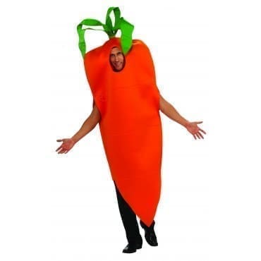 If you still want to be a carrot after that, good for you. That takes guts! This costume comes in the form of a big orange tunic. The bottom edge is open, letting your feet poke out, and there are slits in the sides that let your arms out too! Of course, we put a hole in the front for your face, and right above that is the leafy green part of your costume that would normally be sticking out of the dirt!