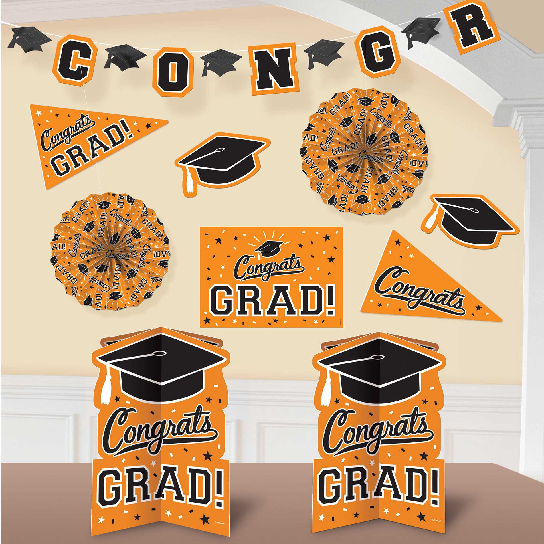 They made the grade, now it’s time to celebrate with an Orange School Colors Pride Decorating Kit. This cardstock and paper decorating kit is bursting with school color and makes a festive party scene to honor your graduate. Easy assembly. The ?School Colors Pride Decorating Kit includes: 1 – 10′ long Congrats Garland 2 – 12″ Paper Fans 2 – 10″ Grad Cap Cutouts 2 – 10 1/2″ Congrats Pennant Cutouts 1 – 14″ Congrats Grad Sign 2 – 10″ 3D Congrats Grad Centerpieces.