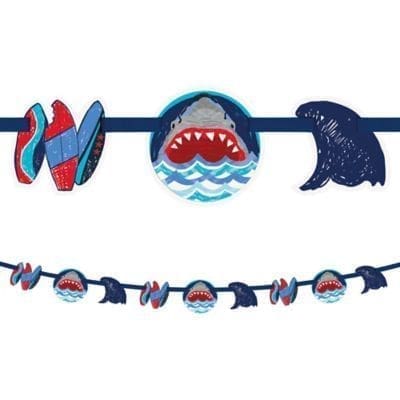 Fun style lurks all over our Paper Cutout Shark Party Garland. Featuring paper cutouts in the shapes of sharks, dorsal fins, and surfboards, this 5-foot party garland will be just the thing for a shark lover’s shark birthday party. Hanging it up is as easy as can be! Just use the strings on each end to attach this shark garland to your wall, drape it in a window, or hang it across the front of your party table! Get ready for a dangerously fun event by shopping the rest of our affordable shark party supplies.